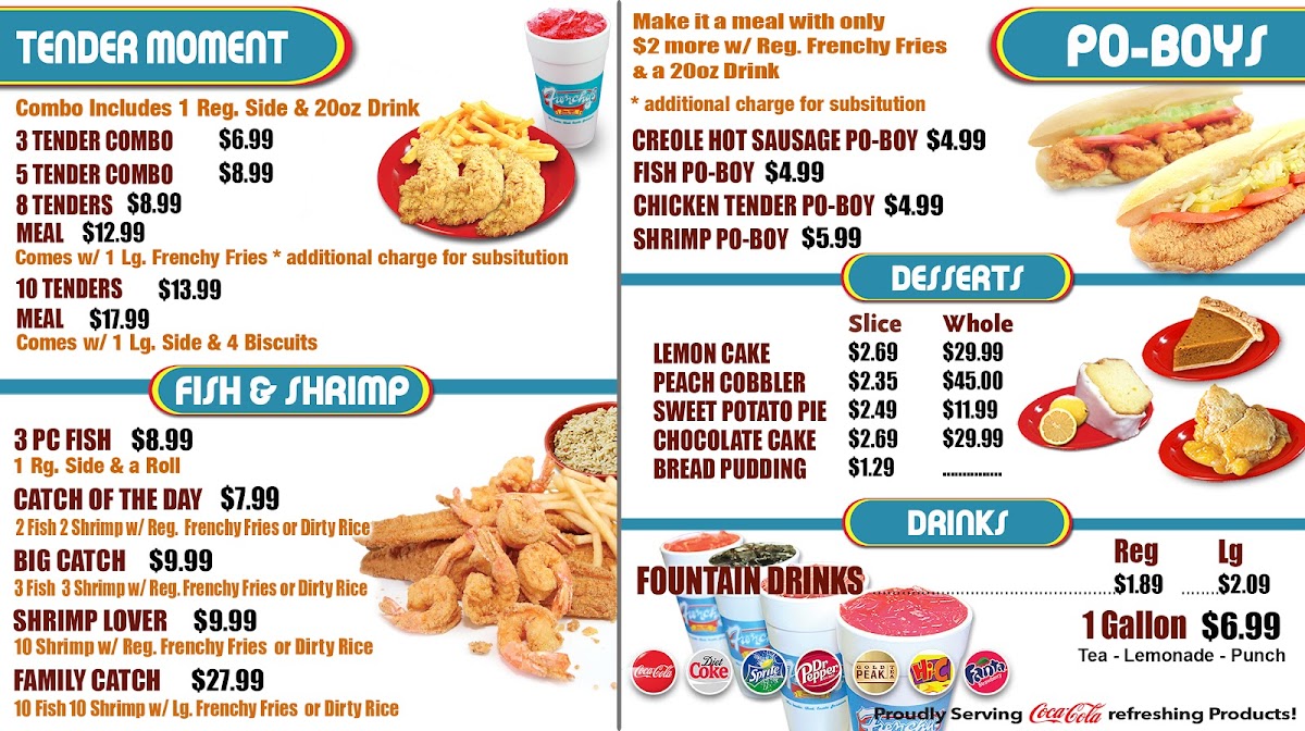 2pc Fish, 2pc Shrimp, Choice of 1 Reg Frenchy Fries or Dirty Rice or Mashed Potatoes